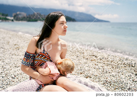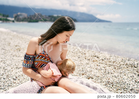 Mom breastfeeds little girl sitting on pebble beach