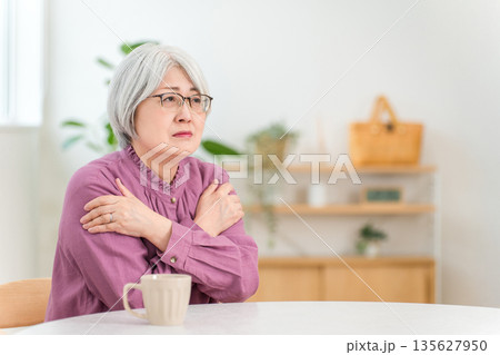 家のリビング,ダイニングで寒くて震えるグレイヘアのシニア女性(薄着,かぜ,免疫力,悪寒)