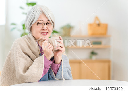 リビングで肩から毛布をかけ寒がるシニア女性(ホットドリンク,温まる,温活)