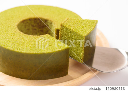 和食器の上に乗せた抹茶バームクーヘン 焼き菓子