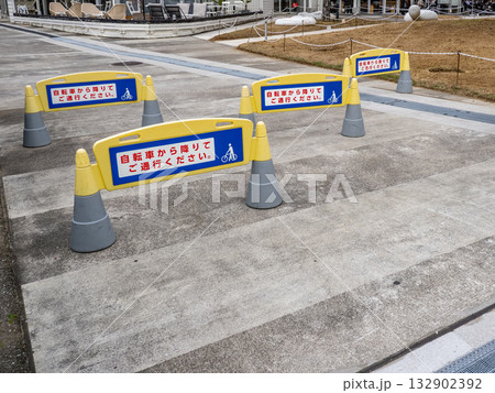 商業施設の敷地に置かれたサインスタンド「自転車から降りてご通行ください」