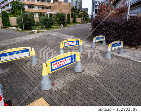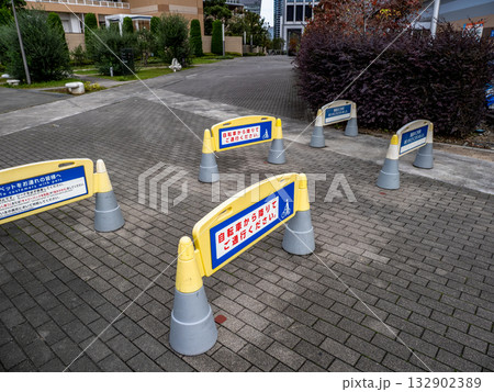 公共施設の敷地に置かれたサインスタンド「自転車は降りて通行してください」