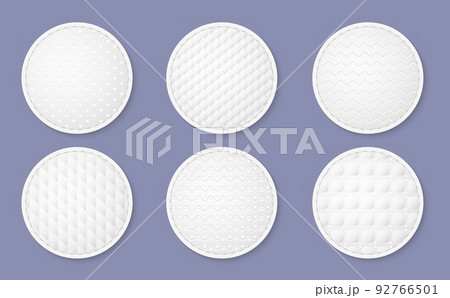 Cosmetic cotton pads texture. Realistic round white discs, hygiene and skin care product, soft face sponge with different embossing patterns, makeup remover accessory, utter vector set