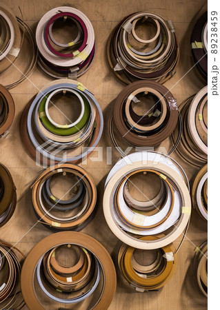 Plastic pre glued edge banding tape for furniture decor and repair. Object is hanging on a wall in a workshop