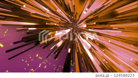 Radiating light burst projecting prism-like rainbow flare in purple digital space, with golden orbs