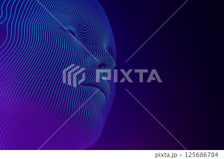 A human face outlined with glowing blue lines on a dark background, symbolizing artificial intelligence, digital identity, or futuristic thinking