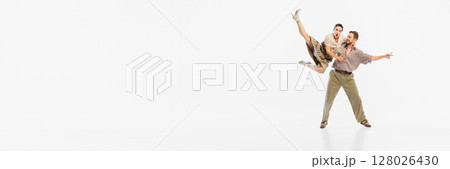 Couple performing energetic swing dance move in vintage attire against white background. Banner