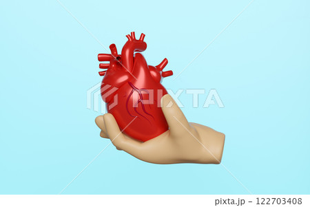 3d hands holding realistic human heart isolated on blue background. 3d illustration render