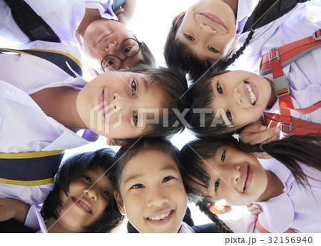 Top view closeup of children stacking hands and huddling celebrating success and teamwork in schoolwith copy space