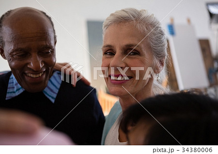 Group of senior friends huddling outdoors, smiling and enjoying time together