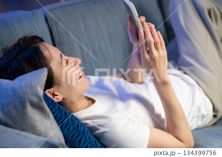ソファーに寝そべりスマホを見る女性