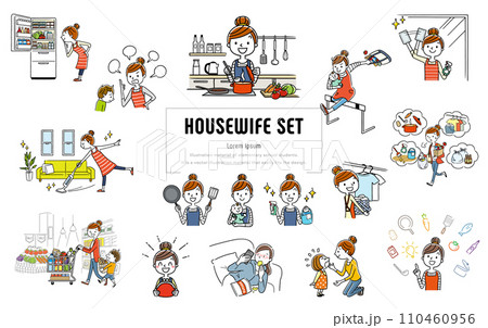 家事をする主婦のイラストレーションのセット