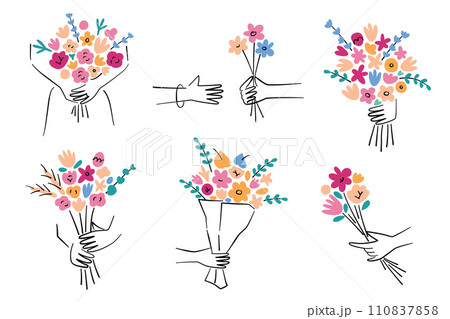 Hands with flower bouquets, flowers hand drawn collection, vector illustrations of floral arrangements in human hands, presents for birthday, Valentines Day, Mothers Day, gift for Womens Day