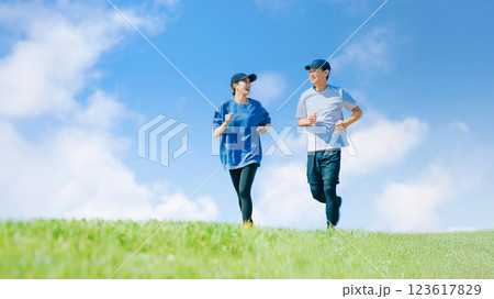青空の下でジョギングをする2人の男女