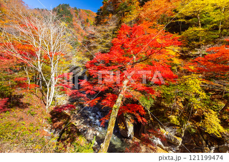 埼玉県秩父市中津川 奥秩父の紅葉の名所中津峡 真っ赤に色付いた持桶の女郎もみじと渓流の流れ