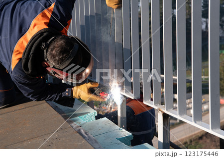 Industrial welder skillfully crafts a metal fence for a new business complex, using modern equipment that casts bright sparks and highlights the precision and dedication of the craft.