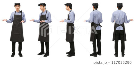 カフェスタッフのエプロン男性の全身人物切り抜き素材