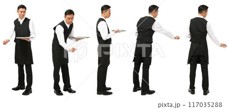 レストランスタッフのベスト姿男性の全身人物切り抜き素材