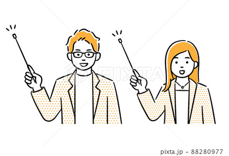 指し棒を持って説明している男性と女性のイラストセット