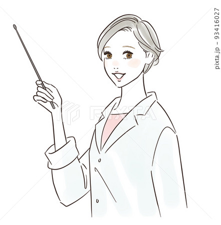 指し棒を使って説明する白衣の女性 ショートカット