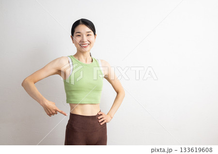 Stomach, wellness and hands of woman in studio for digestion, gut or health on white background. Abdomen, detox and lady person with finger shape for healthy, balance or weight loss, control or diet
