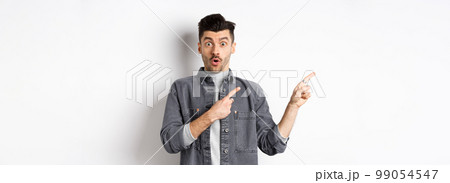 Excited man pointing left at logo and look with disbelief, saying wow at camera, checking out cool promo discount, standing on white background