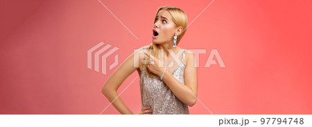 Shocked displeased bothered arrogant blond glamour woman in silver glittering dress turning upper right corner pointing complaining strange noise come upstairs, standing questioned red background