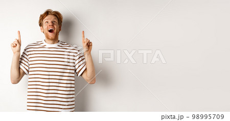 Fascinated redhead man looking with amazement and happiness, pointing fingers up, checking out something cool, standing over white background