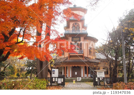 青空を背景に紅葉も美しい旧日野医院(近代建築・洋風建築)