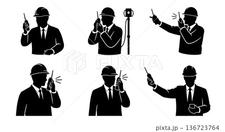 Black Solid Worker with Walkie Talkie Silhouettes Set of Six on White Background