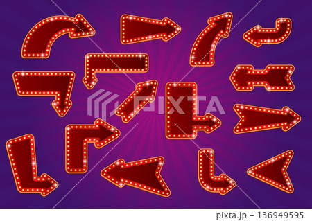 Lightbox arrows. Marquee signage pointers frame, retro signboard with bulb light lamp signs vintage neon billboards direction pointer arrow banner cartoon kicky vector illustration
