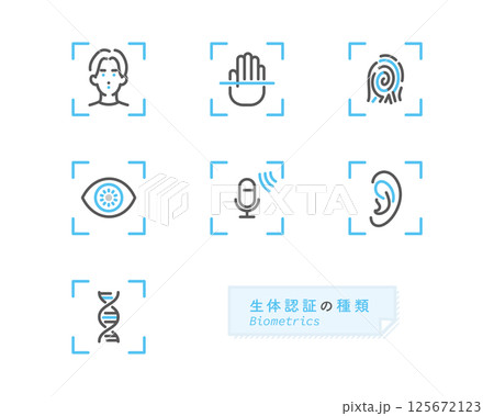 生体認証のアイコンのセット 指紋、静脈、虹彩、DNA、声、顔など 線幅可変