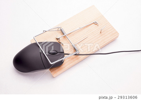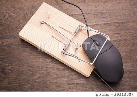 木のテーブルの上のネズミ捕り器にかかったマウス