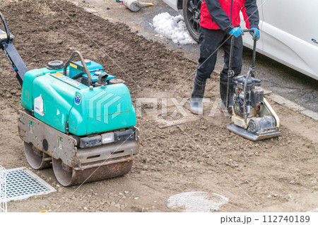 道路工事 振動ローラー プレートコンパクター 転圧作業