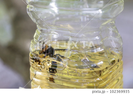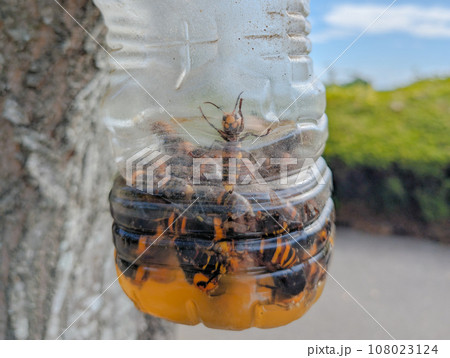 ペットボトルの捕獲器に入ったオオスズメバチ