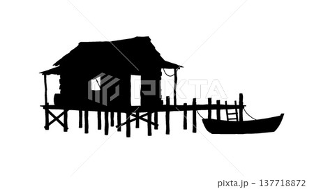 水上家屋とボートのシルエット