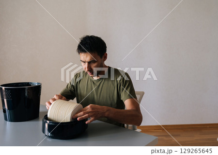 Man meticulously cleaning or replacing filter of air humidifier, promoting clean and healthy air in living space while enhancing overall comfort and wellbeing. Concept of maintenance home appliance.