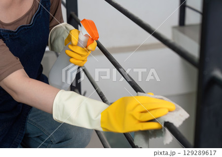 Home Cleaning. Close-up of young woman cleaning railing with spray cleaner.