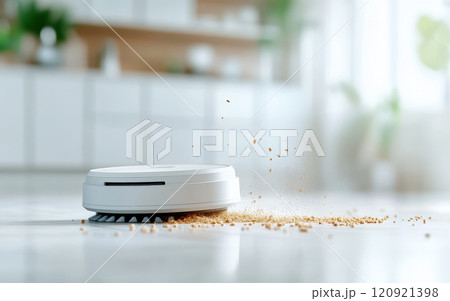 Modern vacuum cleaner lifting dust on tiled floor, showcasing efficiency and cleanliness in bright, airy space. Perfect for home cleaning and maintenance
