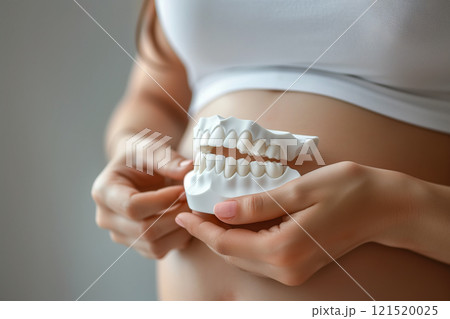 Close-up of pregnant woman holding tooth model near belly, emphasizing dental health