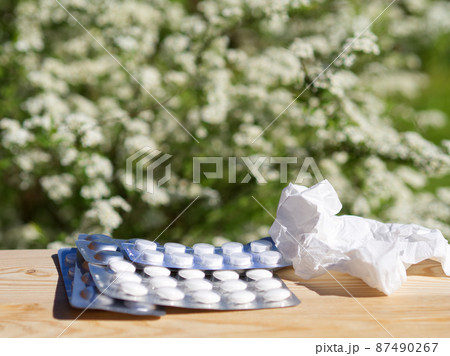 Medicine pills, handkerchief on table on green nature background