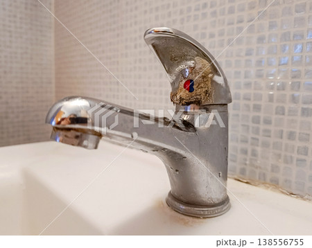 Worn Bathroom Faucet with Mineral Deposits and Dirt