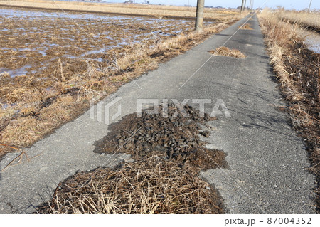 田んぼの中の道路に積もる、タヌキの溜め糞