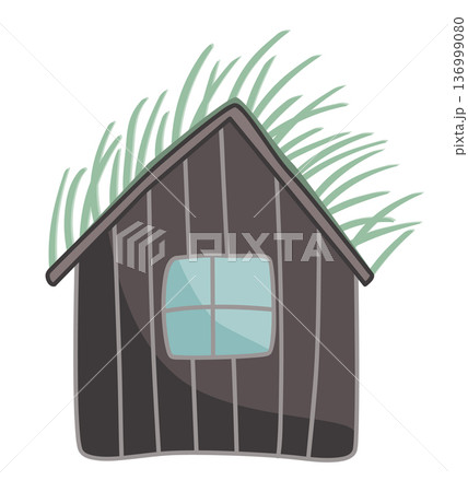 Traditional Icelandic or Norwegian wooden house with a grass roof. Vector isolated illustration