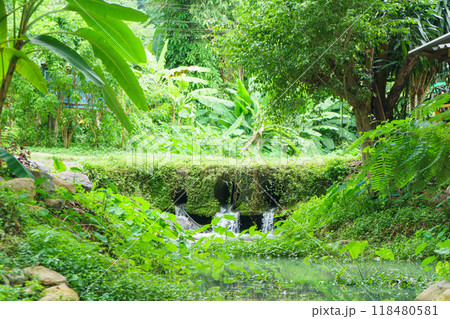 A serene landscape featuring lush green environment with small stream flowing through. vibrant foliage and tranquil water create peaceful atmosphere, perfect for nature lovers