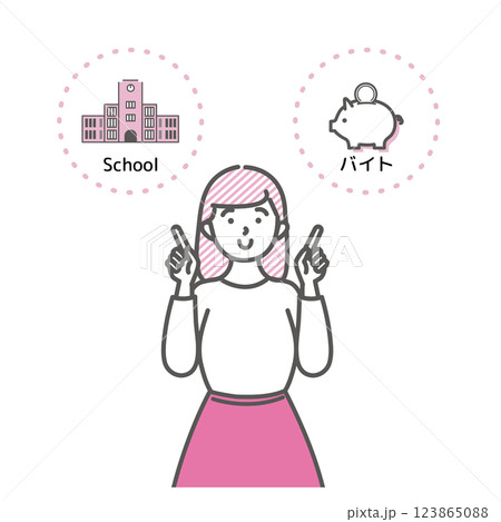 学業とバイトの両立ついて説明する女子大学生のイラスト