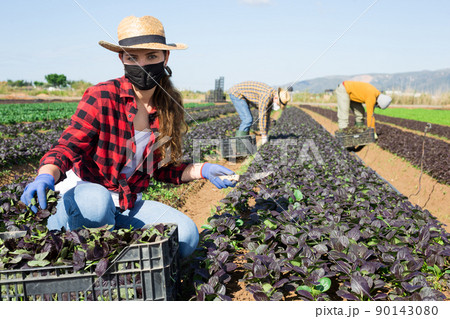 Inspired Hispanic woman farmer agronomist in work yellow raincoat cutting fresh swiss chard grown in the open ground