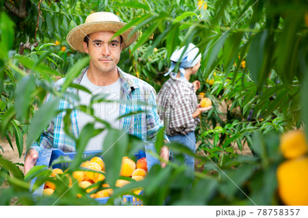 Successful male owner of orchard gathering harvest of ripe peaches on day
