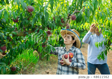 Positive woman engaged in gardening, picking fresh peaches in orchard