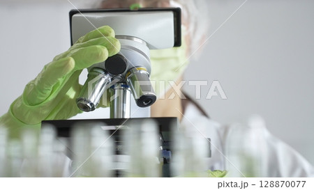 Gloved scientist adjusting a microscope, conducting research in a laboratory setting, surrounded by scientific equipment. Medicine, healthcare and science concept